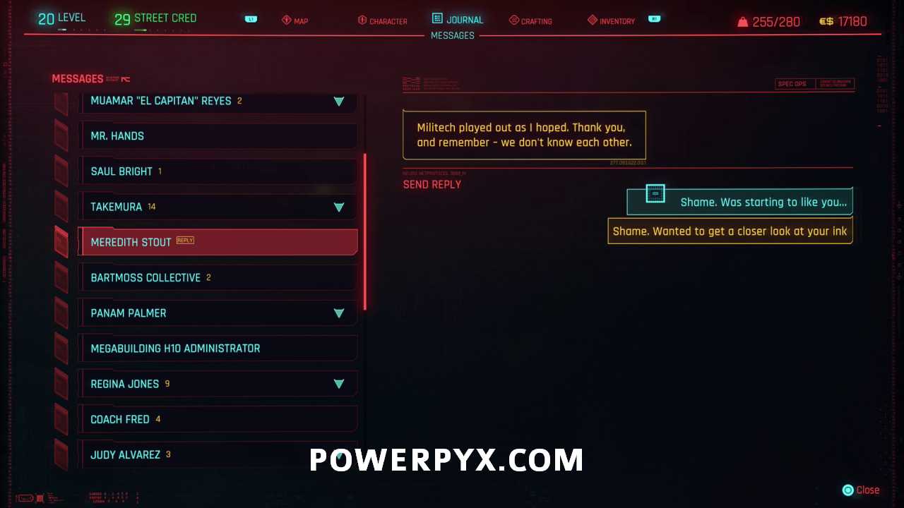 在“接机”主要任务(故事中很早的第六次主要任务)中,将有一个可选目标可以与Corpo Agent Meredith Stout进行交谈。不要攻击她或她的保镖。与她交谈以完成可选目标。您可以接受她给您的现金筹码,也可以不接受(没关系)。这些是我选择的Meredith对话:“ [握手]正确”>“我只想说话”>“是的。全靠我的寂寞。” >“不认识他”>“您需要信息。我想要一个机器人。让我们达成协议。” >“没办法。不会发生。”