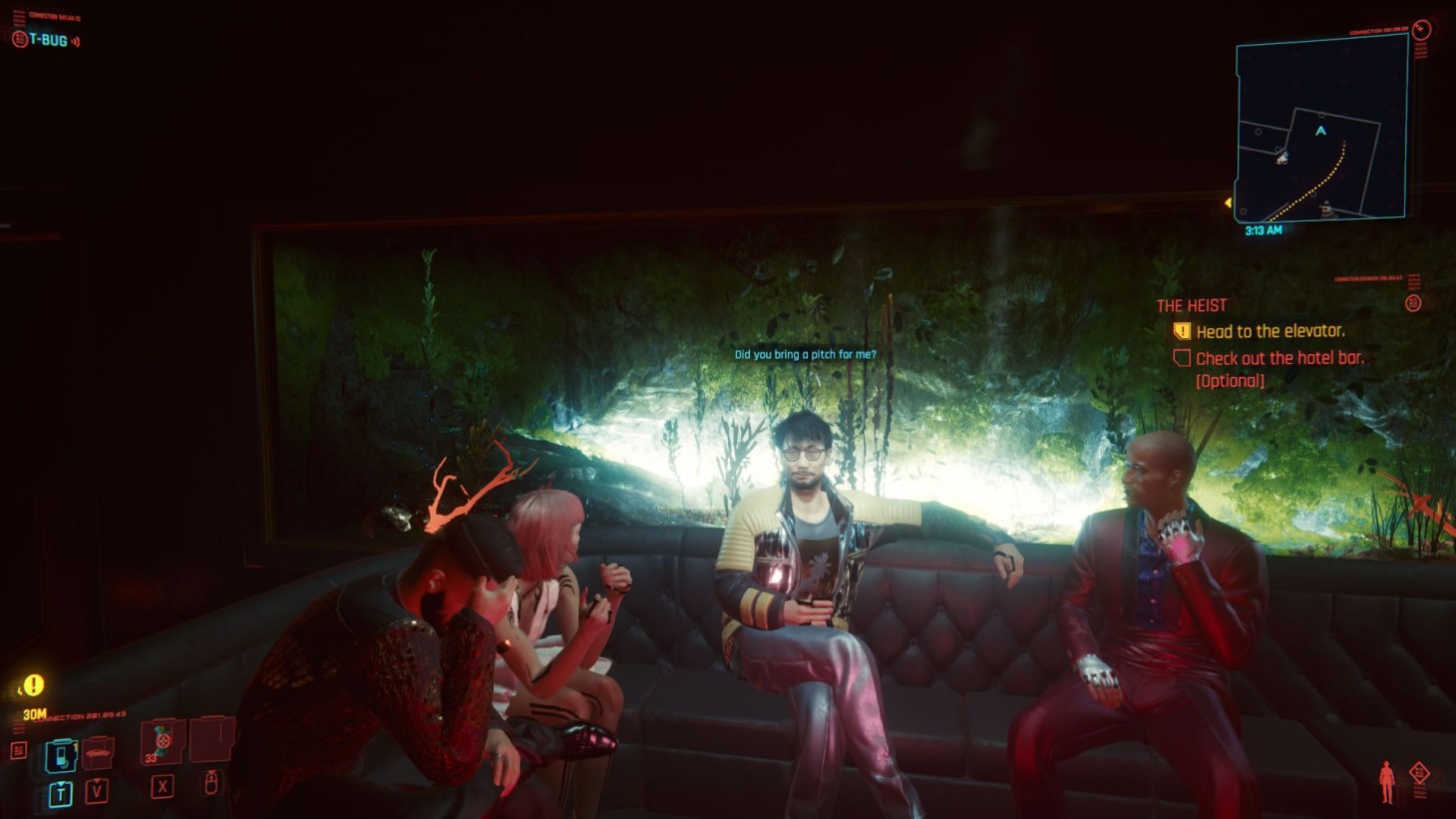 在游戏中进行任务时进了奢华的Corpo酒吧,看见里面都是些衣着光鲜,出手阔绰的顾客,还有人吹嘘在游艇上举办的派对。