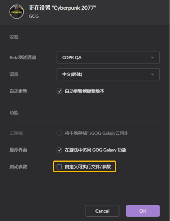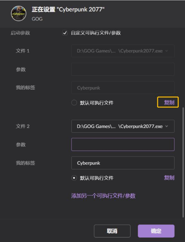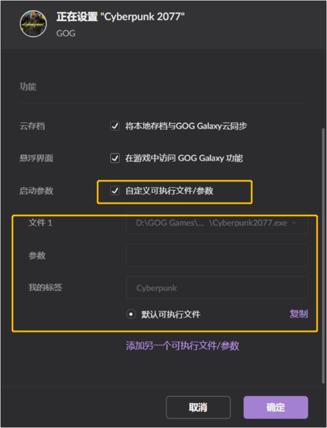 4.在设置弹窗中,勾选*自定义可执行文件/参数*后,显示可执行文件设定组