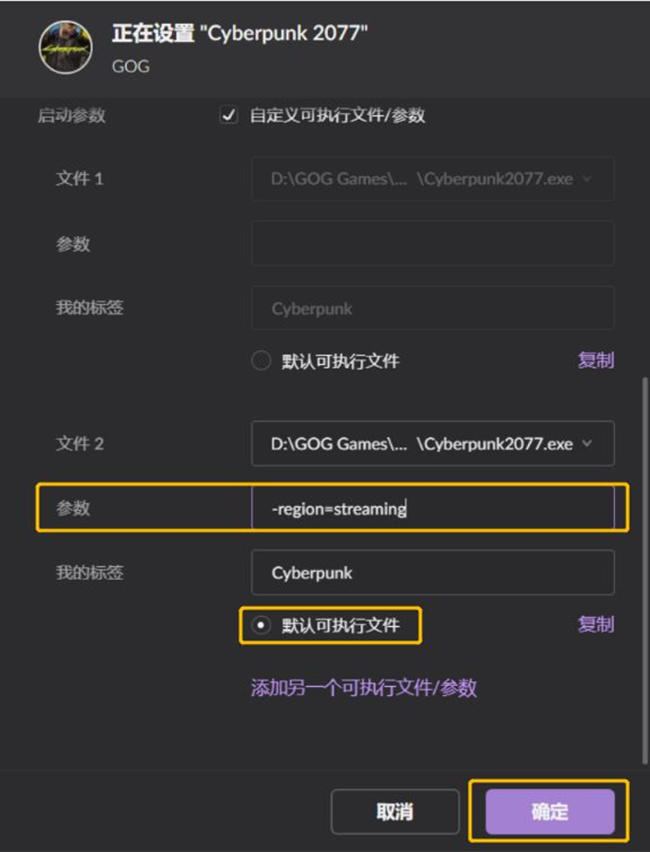 5.点击*复制*复制出一个新的可执行文件设定组,并在参数栏位添加 -region=streaming字段后点选将其设置成默认可执行文件,点击OK按钮后完成设置。