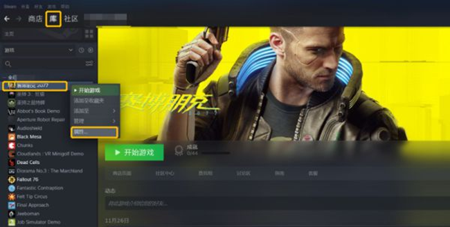 2.点击菜单栏*库*选项,鼠标右键点击游戏列表中的《赛博朋克2077》并点开*属性…*菜单项