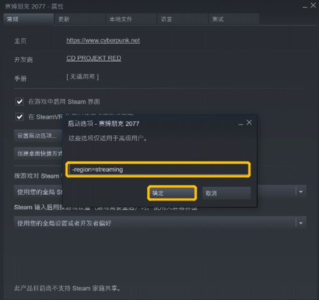 3.在设置窗口中向下滚动菜单列选择《赛博朋克2077》游戏,勾选*额外命令行参数*后在输入框中添加-region=streaming字段后返回