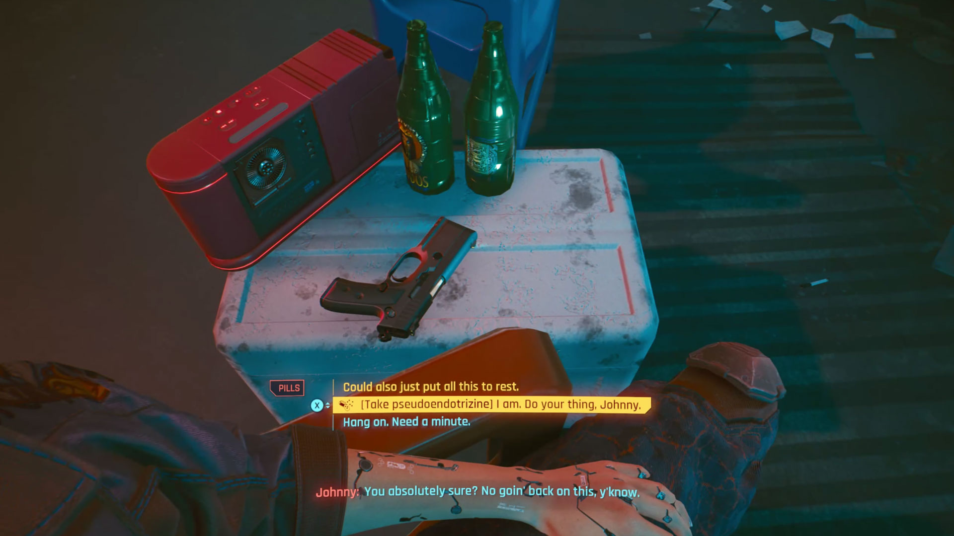 如果以上选项都不是您感兴趣的,您可以选择结束所有操作-毕竟,Vik出于某种原因给了您手枪。当您选择其他任何结束路径时,此选项都会显示出来,此后强尼会说“再也没有回头了,知道”。然后,您可以选择“休息”。如果选择它,V将把药丸从屋顶扔掉。
