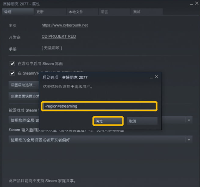 3.在设置窗口中向下滚动菜单列选择《赛博朋克2077》游戏,勾选*额外命令行参数*后在输入框中添加-region=streaming字段后返回