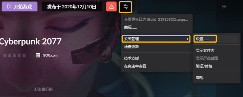2. 确定您的游戏库里拥有《赛博朋克2077》后点击左下侧*设置*选项