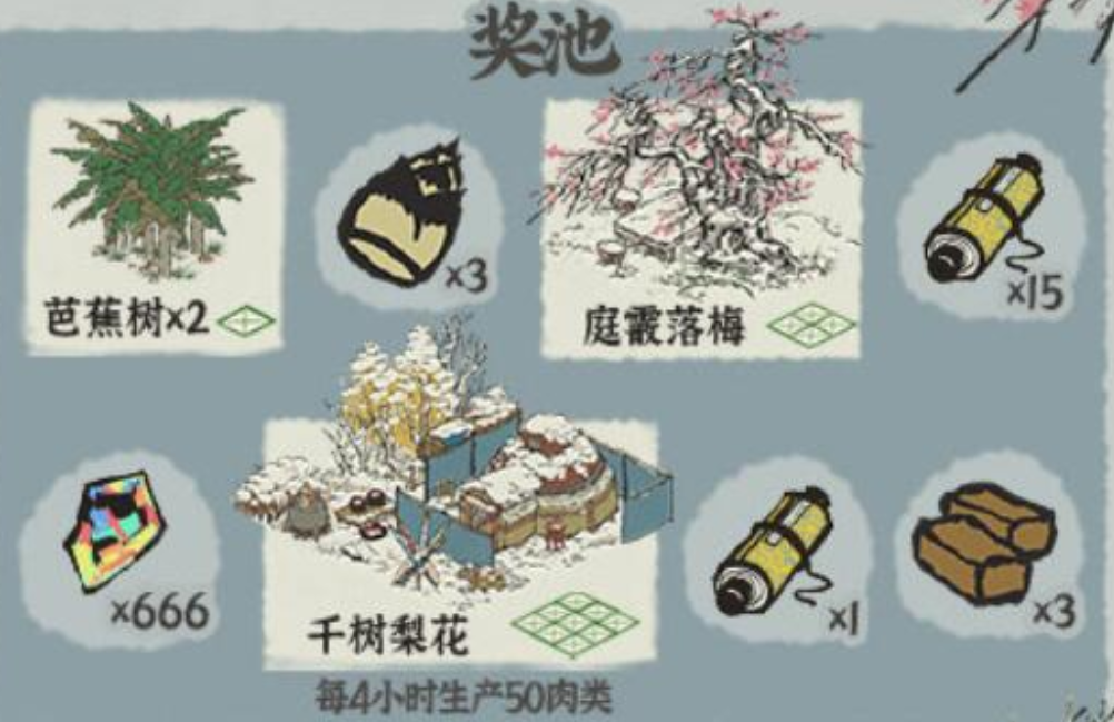 参加积雪浮云端限时抽奖活动,卡池中有芭蕉树。有两颗可以获得哦。