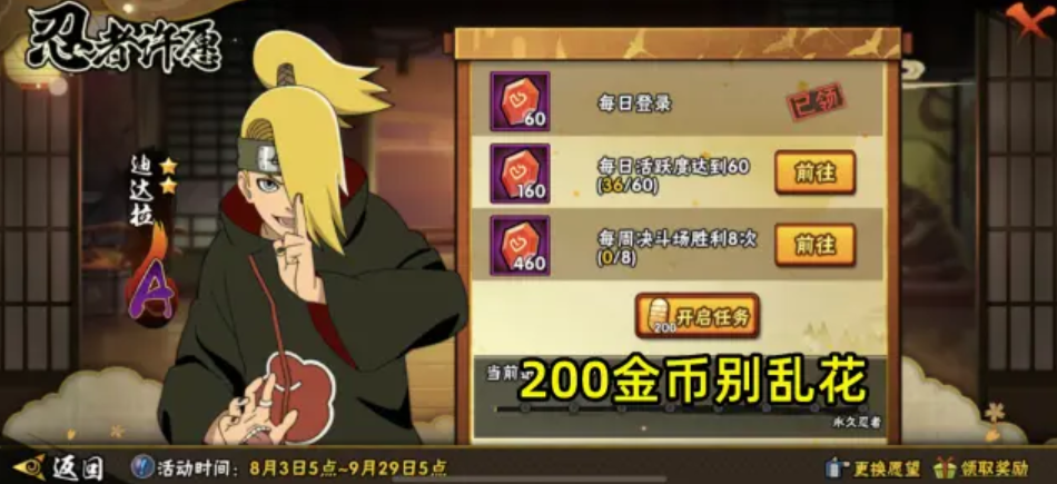 最后再提前跟一些没有参与过这个活动的玩家说一下这个忍者许愿的规则,但需要注意哈,这个规则只是上次的情况,不确定这次是否会有改动,各位可以先参考一下。这个活动就是通过每日和每周的一些任务来领取到许愿宝石,但在任务界面上会有个金币开启任务的按钮。这个按钮有很多玩家以为是不用金币没办法拿到忍者,其实这个按钮只是用金币开出额外的任务,让你更快的拿到忍者,并非是必须要开的。
