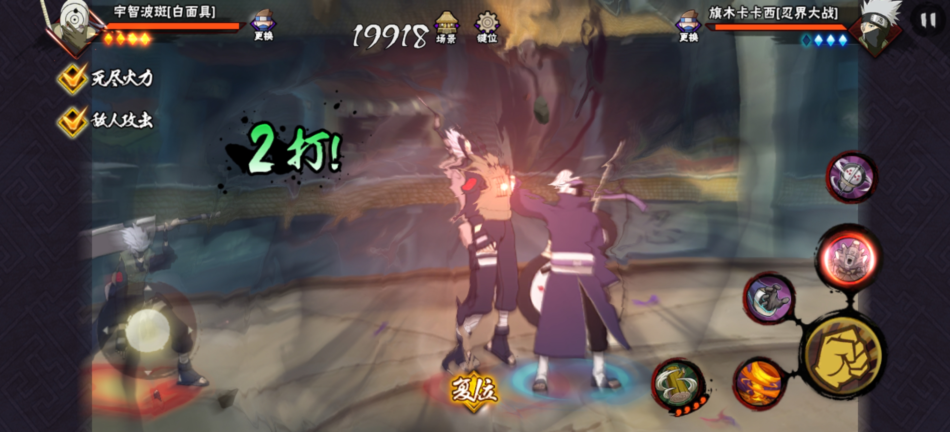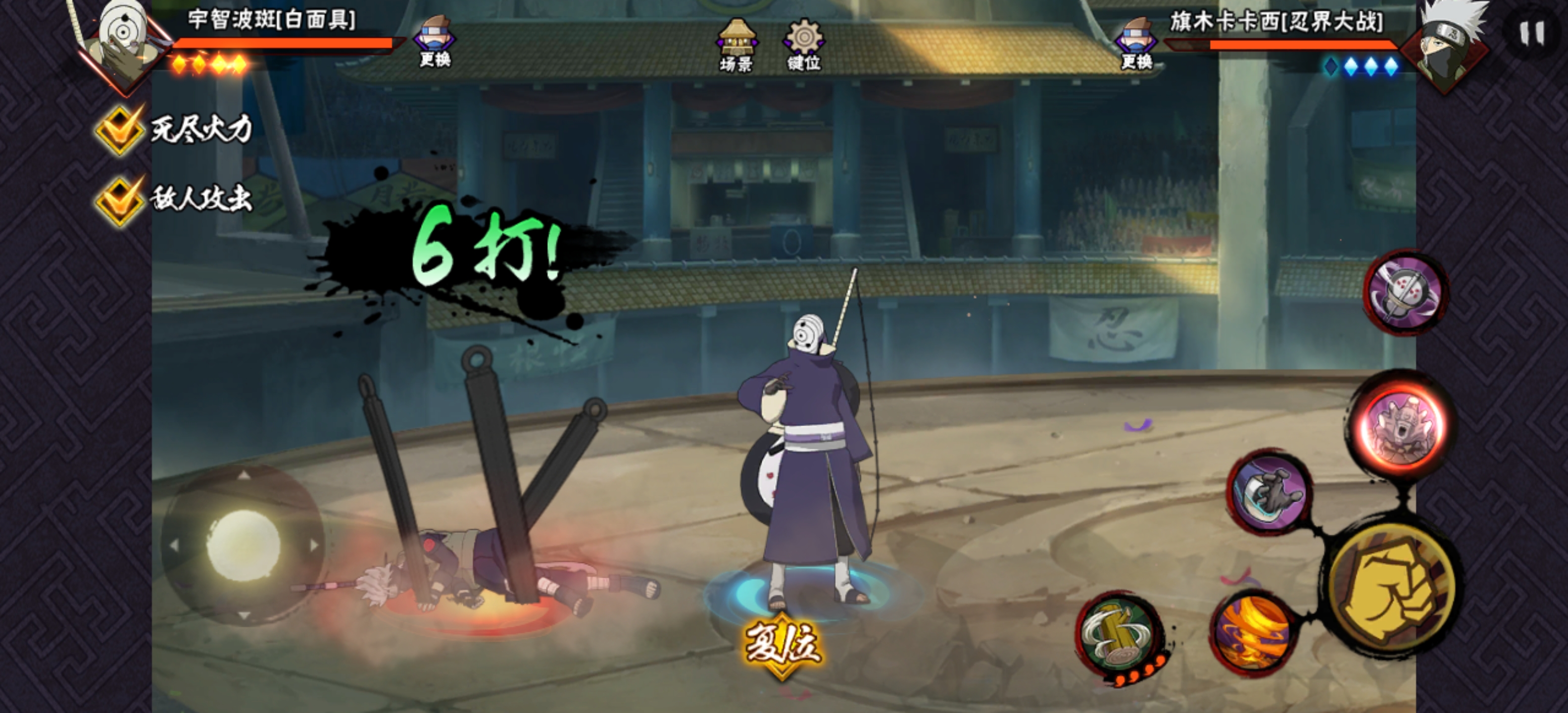 2、白面具首次登场遇到卡卡西,应该是所有成年版本都会有,防反住就可以触发,并且切换到神威空间场景,但是因为练习场不会出现场景更替,接下再防反就是普通的了。