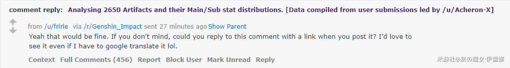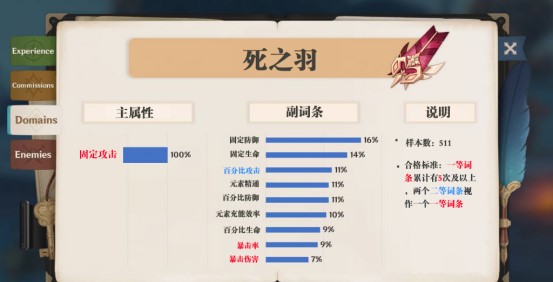 注二:以上的圣遗物统计数据源自外网作者统计了约2600件圣遗物的各属性出现概率,我在此基础上做了一些修改,使各位能够在了解每个部位圣遗物的最佳主属性选择的同时,对每种属性的出货率有一个直观的感受。