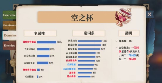部分角色(可莉/凝光)突破属性,武器特效(四风原典,弓藏),少量角色技能(莫娜大招,甘雨天赋2)因此空之杯上我们基本必定选择属性伤害加成。