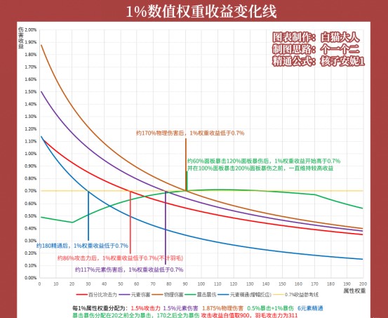 各种属性之间本身并没有优劣之分,百分比攻击力并不比双爆差,在额外攻击力达到86%(不计羽毛)以前收益甚至会超过成型的双爆。但是由于同区间收益会稀释,我们需要尽量去合理分配属性来使收益最大化。