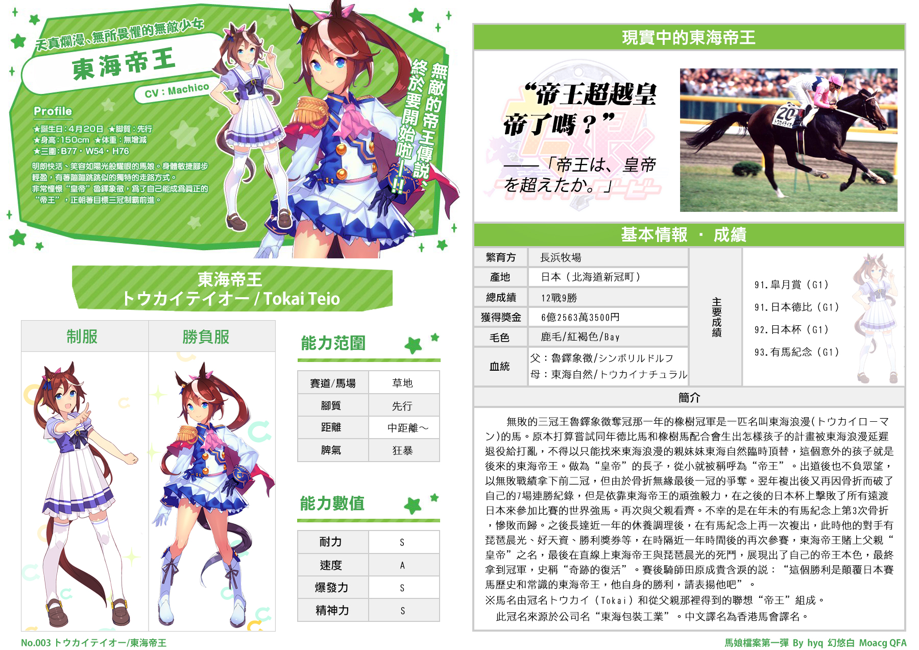 明朗快活、笑容如阳光般耀眼的马娘。身体敏捷脚步轻盈,有着蹦蹦跳跳似的独特的走路方式。非常憧憬“皇帝”魯鐸象徵,为了自己能成为真正的“帝王”,正朝着目标三冠制霸前进。