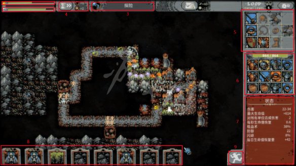 【界面介绍】 1:时间 2:关卡进度 3:当前状态 4:加速 5:装备栏 6:拥有装备 7:状态栏 8:拥有卡牌 9:返回营地