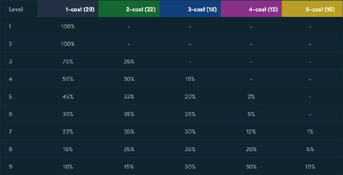 接下来重点谈谈这个阵容的后期运营。在11.5版本改动以后7人口拿4费天选变得比较困难了,这个阵容需要的4费卡3张,5费卡2张,所以7人口只要有血量、有经济,就等8人口再搜牌,看看在11.5 8人口搜卡的概率: