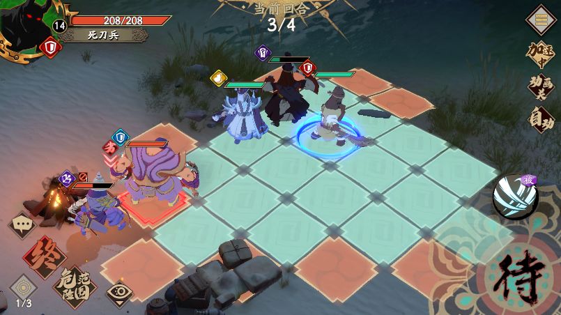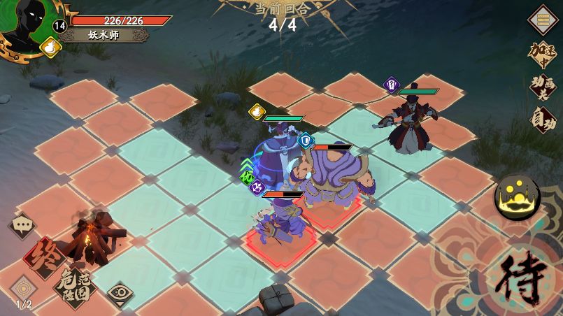 3、对方击杀我方骷髅,并且攻击死灵术士,我方回合开始,死灵走到蓝蘑菇上同时攻击对方残血。再次行动后召小弟技能cd好了,再召唤一个小弟。