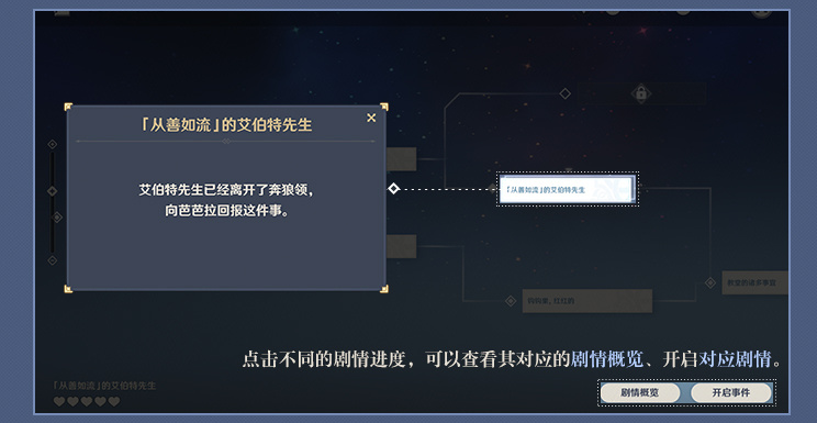 点击不同的剧情进度,可以查看其对应的剧情概览、开启对应剧情。