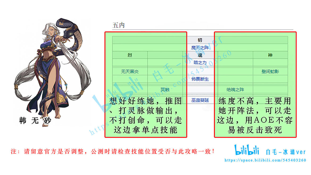 韩无砂是一个比较优秀的英灵,如果玩家不打创命,只想推图打灵脉可以选择烈这条线,如果主要是为了开阵,可以选择神这条线