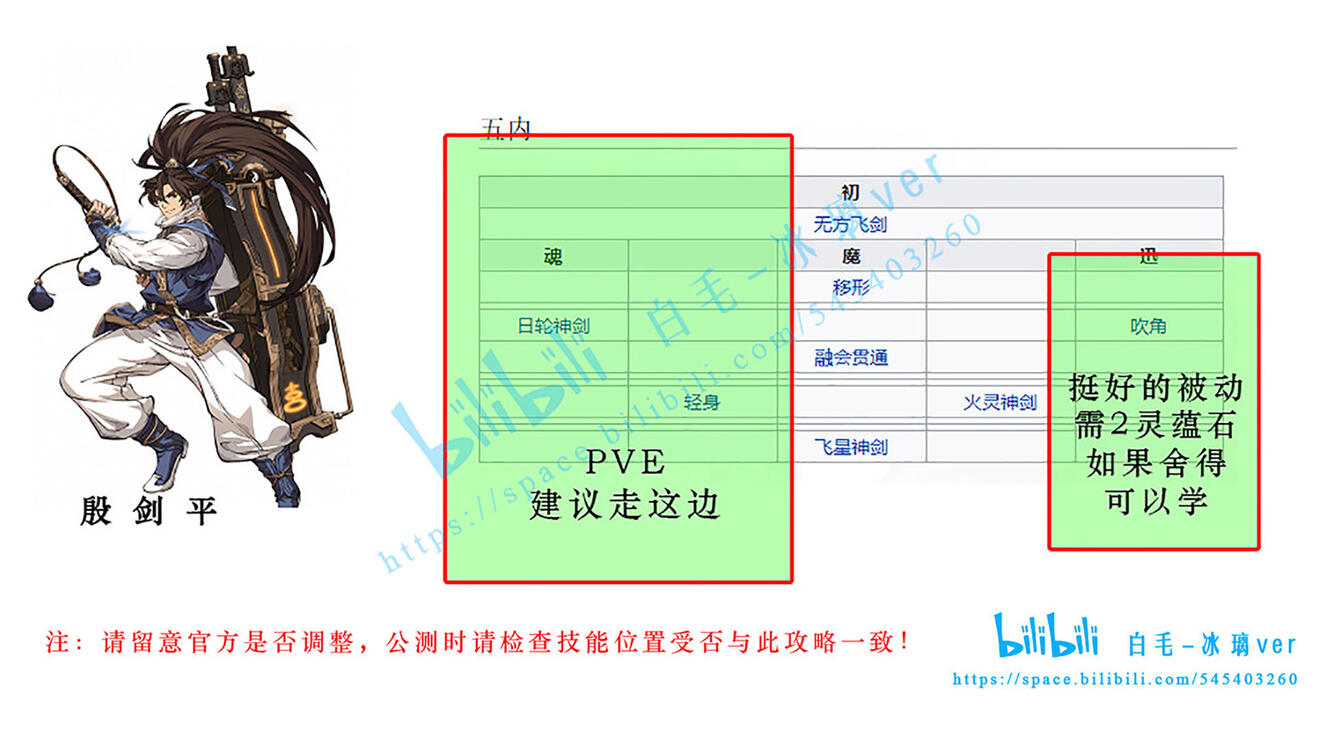 殷剑平PVE路线主加魂线,有条件的玩家可以学习一下吹角,这是一个被动BUFF,可以物攻和物防。PVP玩家可以按需选择技能。