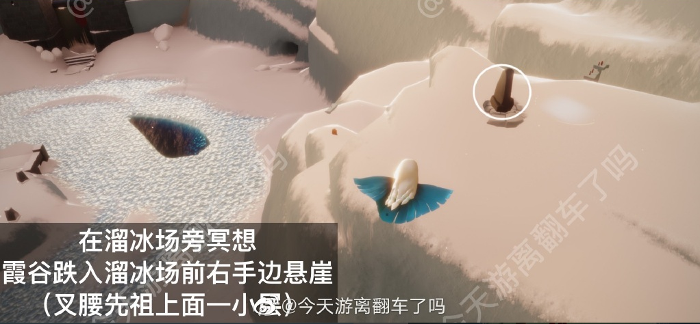 蓝色光芒其实就是水之灵,在霞谷的溜冰场,如下图所示的位置,不过蓝色光芒会经常钻湖底。