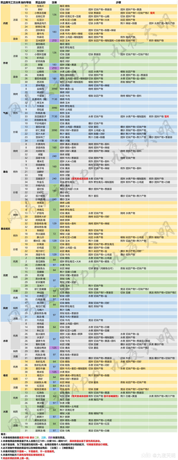 1.本表格收录的是截至38级 部分二阶、三阶、四阶各属性菜品。