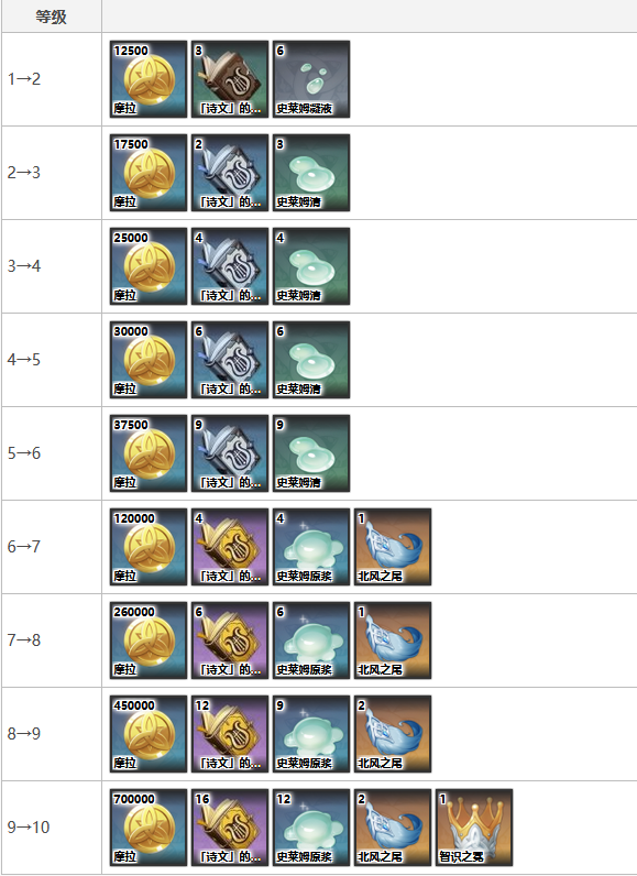 温迪的天赋升级主要需要诗文系列的技能书,包括诗文的教导、诗文的哲学、诗文的指引,然后就是怪物掉落材料史莱姆凝液、史莱姆清、史莱姆原浆和北风之尾,具体数量如下所示