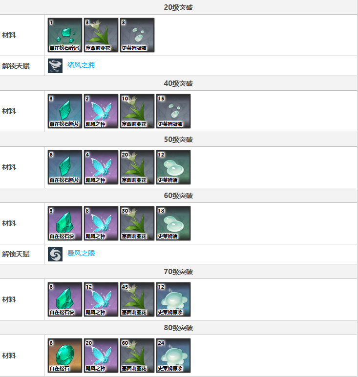温迪是风系角色,所以等级突破材料需要大多数都是无相之风掉落的材料,包括自在松石碎屑、自在松石断片、自在松石块、自在松石以及飓风之种,除此之外,还需要采集材料塞西莉亚花和怪物掉落材料史莱姆凝液、史莱姆清、史莱姆原浆,具体数量如下所示: