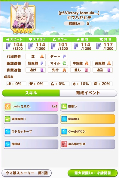 技能四个绿技其实还不错,运气好可能四个同时触发,再加上本身叹号直接给三级点一下应该只要50-60pt,有一个针对追马的红技能,但是考虑到事件给的两个长距离技能,正好在长距离抓皮皮船,整体搭配比较合理。一个小缺点是两个事件一共扣30体力, 不过无伤大雅