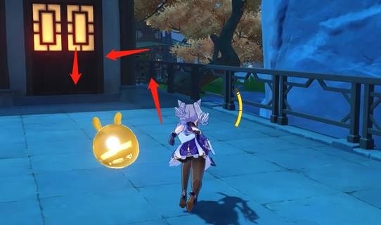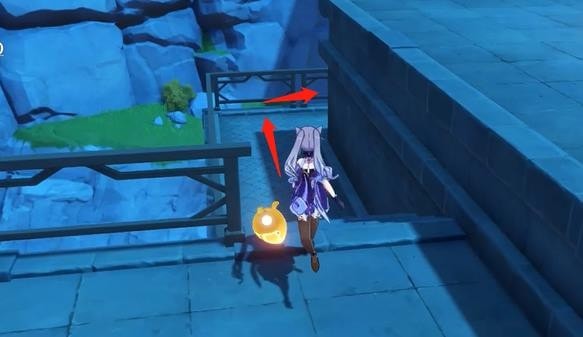 2、在桥拐角的墙前,我们就能看到躲在这里的重云。