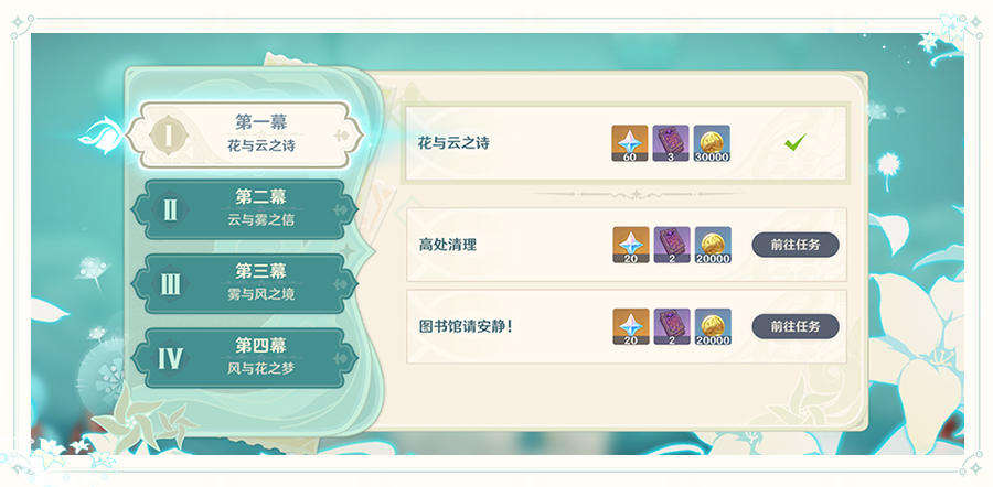 「节日逸闻」共分为四幕。每幕逸闻中,将会随时间开放剧情任务和居民委托任务,完成相应任务后可获得原石、角色经验素材、摩拉等奖励。