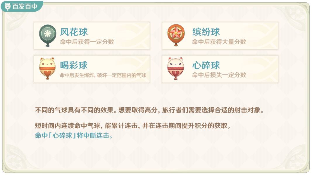 友情提示: 在这种挑战中,只有普通攻击与重击可以击破气球(瞄准射击视为重击)。推荐玩家们邀请擅长使用弓的伙伴来进行挑战哦。