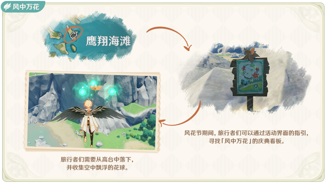「风花的邀约」活动共分为三个部分:「节日逸闻」「庆典挑战」「奇趣秘园」,具体玩法如下。