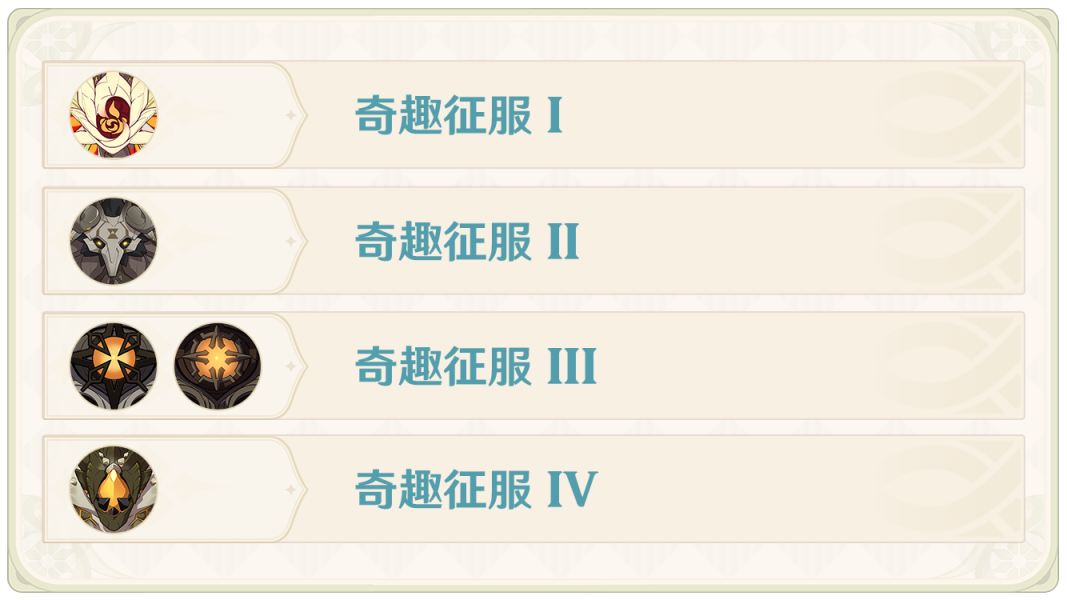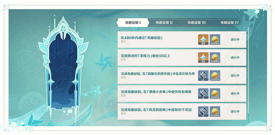 此外,完成奇趣征服中的任务,还可以获得原石、天赋培养素材、摩拉等奖励。 玩家们可以在活动界面查看奇趣征服的任务详情。