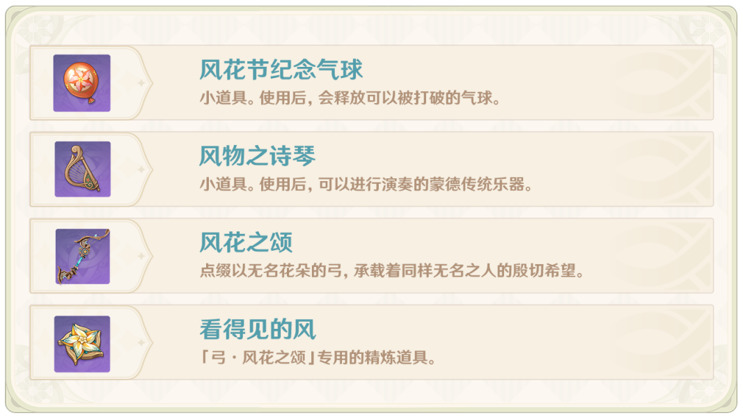 活动期间,玩家们可完成与「风花节」相关的挑战,获取「庆典巡回券」与「奇趣协力券」两种奖励票券。使用奖励票券可在活动商店中兑换活动专属武器「弓·风花之颂」、风花之颂专用精炼道具「看得见的风」、智识之冕等奖励。