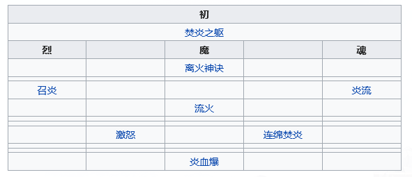 焚炎之躯:主动使用,消耗自身气血20%,获得「炎之力」状态,持续2回合。获得再行动(2格)。「炎之力」:与携带「燃烧」状态的目标对战,战斗中伤害额外提高20%