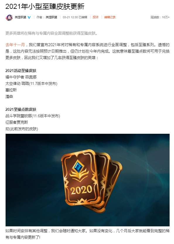 今日,《英雄联盟》官方微博宣布,去年十一月宣布的精简稀有道具获取的计划不能如期推出。这个计划原定今年中期上线,虽然延期了,但官方表示计划仍在今年内完成。同时游戏将增添几款可通过至臻点兑换获得的至臻皮肤。