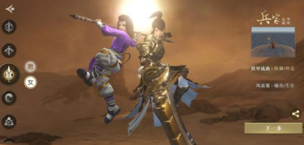 兵家是游戏里唯一的坦克,也是副本必要的角色(高难度副本必备),着重于副本PVE,PVP在团战中才会有发挥特点,铁甲战曲属于防御坦克,承担前排对BOSS的抗伤,风雷策作为一个输出类坦克,有一定的输出能力。因为对战力和属性有所要求,不推荐0氪玩家使用。