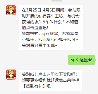 问题:在3月25日-4月5日期间,参与限时开启的钻石赛车工坊,有机会获得的永久A车叫什么?