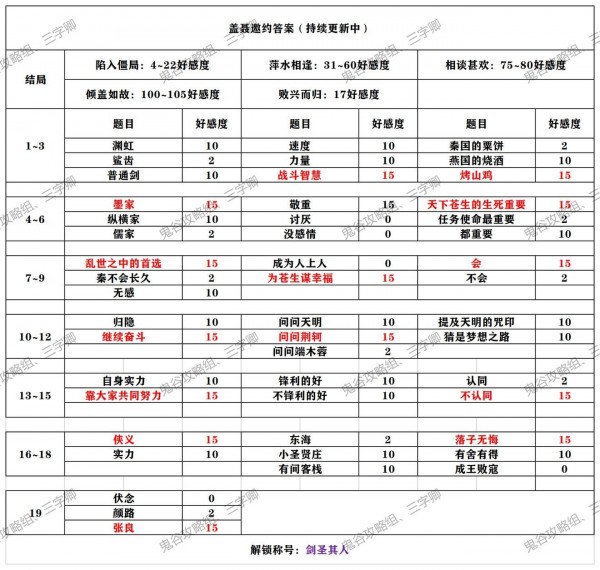 题目19:伏念:0好感度/颜路:2好感度/张良:15好感度
