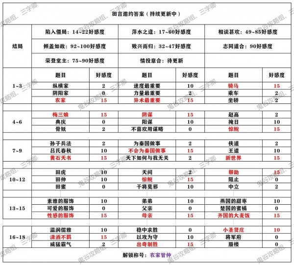 题目1:农家,+15好感度。纵横家,+2好感度。阴阳家,+0好感度。