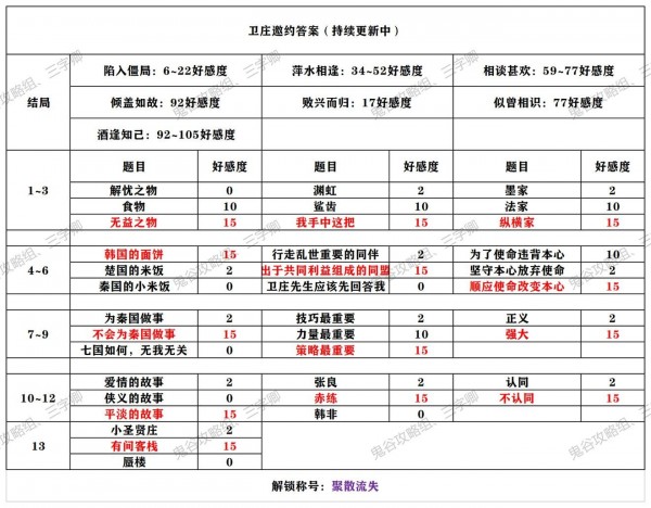 题目3:纵横家,+15好感度。法家,+10好感度。墨家,+2好感度。