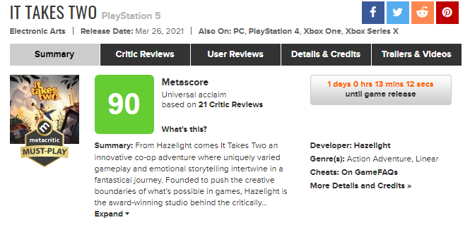 本作在M站均分90,21家媒体均为本作给出好评,并且直接上榜M站必玩游戏榜单。