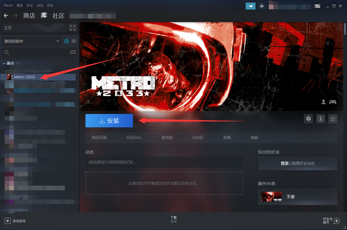 购买后下载steam客户端,然后在steam客户端内找到即可下载,以metro 2033为例,如下图。