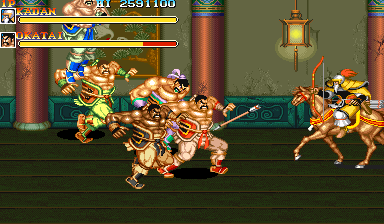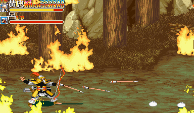 三国战纪里面也有弓箭手,有2种弓箭手,一种是第一关开始跳下船就朝你放冷箭的弓箭手(打扮得像个印度阿三),还有一种是在后面经常成群结队出现的那种戴头盔的弓箭手,生命力比较脆弱。