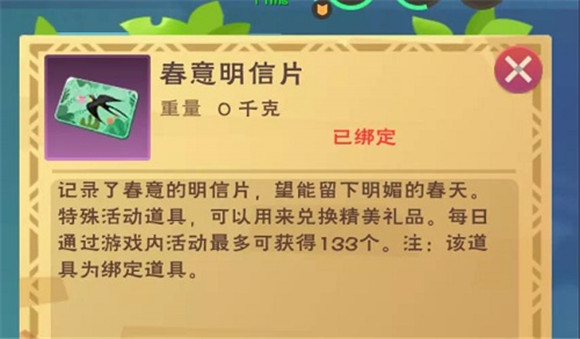 在3月26日-4月4日期间,玩家前往贝雅大陆,通过挖矿、砍树、采集、击杀小动物,都有几率获得春意明信片