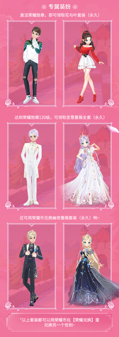 同时,也将迎来全新的荣耀勋章专属套装,圣雪蔷薇亲子装、幽夜蔷薇、花与叶套装将一同上线。