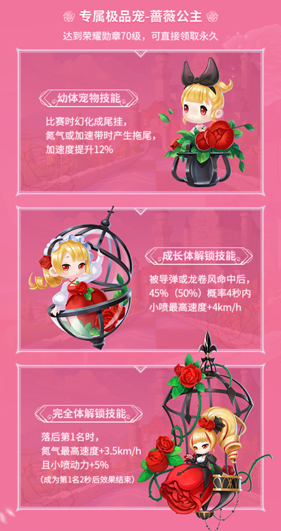 美丽的蔷薇含苞待放,可爱的极品萌宠蔷薇公主也将来临,当车手们达到荣耀勋章70级就可以领走这只可爱的小仙子咯!
