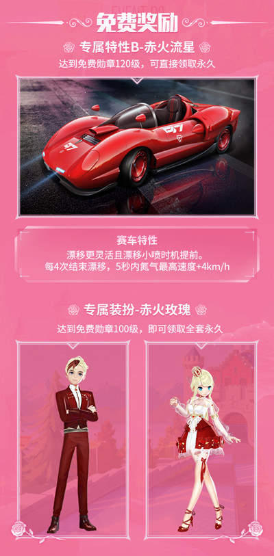 车手们是不是也很好奇免费勋章里有什么奖励呢?放心,车手们达到免费勋章对应等级,即可领取永久特性B车-赤火流星和赤火玫瑰套装,没让你们失望吧!