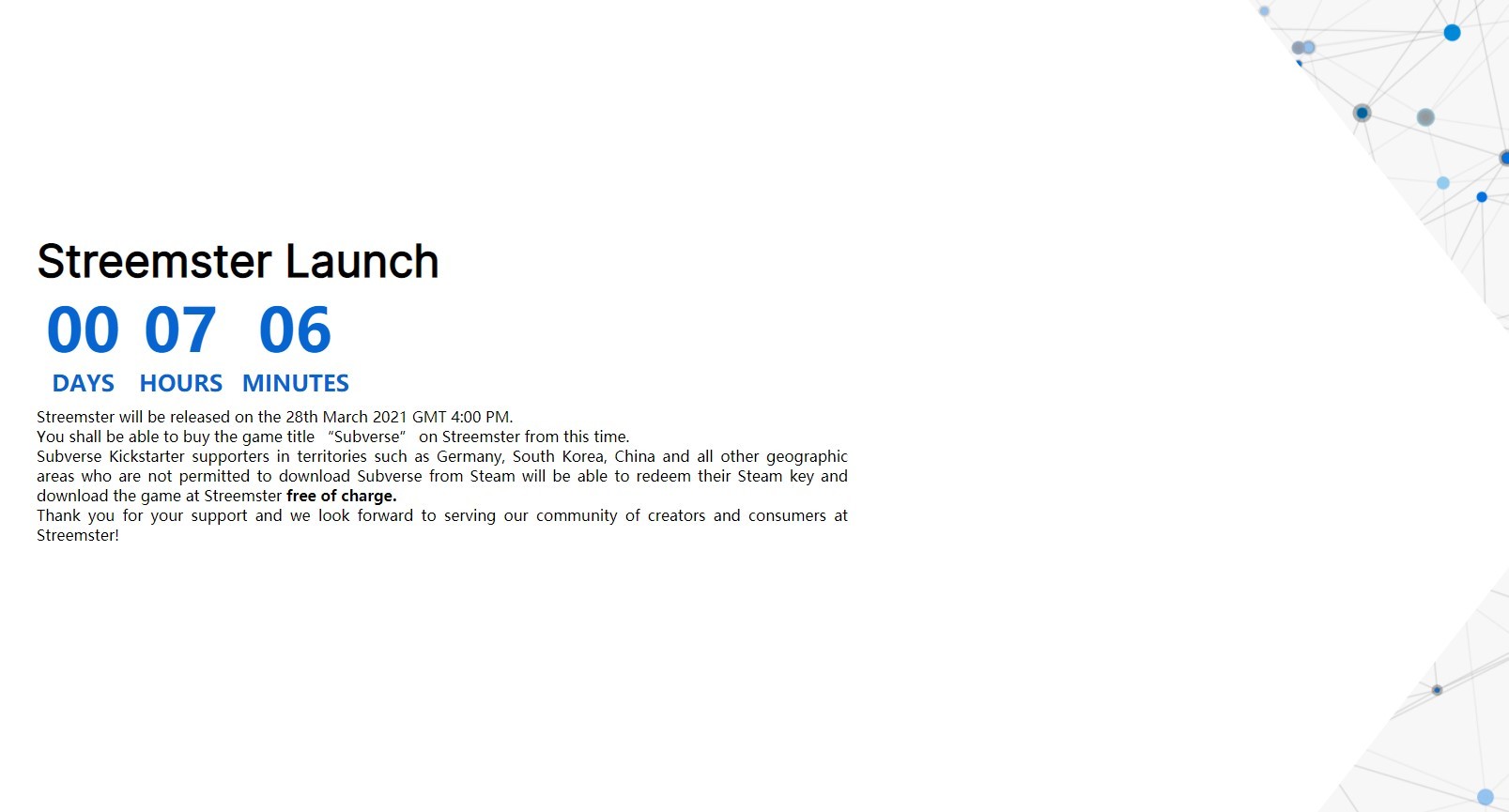 《Subverse》于3月26日在Steam商店正式发售,游戏美区售价29.99美元,目前的评价为“特别好评”。据马头社开发者日志所述,为了让Steam锁区玩家也能购买游戏,《Subverse》将上线他们打造的PC新平台“Streemster”,新平台将于格林尼治时间3月28日下午4点(北京时间3月29日0点)解锁。