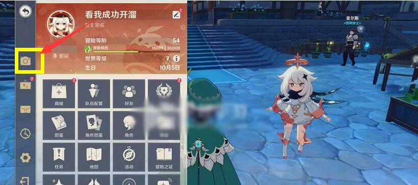 2、然后我们站在芙萝拉的对面,点击派蒙按钮;
