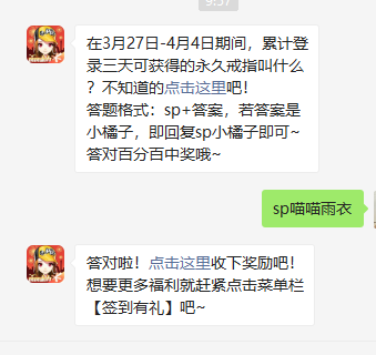 问题:在3月27日-4月4日期间,累计登录三天可获得的永久戒指叫什么?